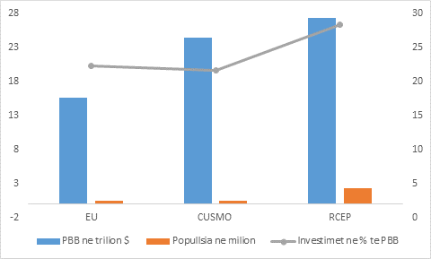 Këto vende, të gjitha së bashku, kanë një popullsi prej 2.2 miliard njerëz, dhe niveli i Produktit të Brendshëm Bruto është rreth 27.2 trilion dollarë. Blloku i ri i tregtisë së lirë do të jetë më i madh se marrëveshja SHBA-Meksikë-Kanada (CUSMO) dhe Bashkimit Europian. Popullsia dhe PBB-ja e kombinuar e anëtarëve të RCEP tejkalon popullsinë dhe PBB-në e kombinuar të Marrëveshjes së Shteteve të Bashkuara - Meksikë - Kanada (CUSMO), si dhe marrëveshjes së Bashkimit Europian.
