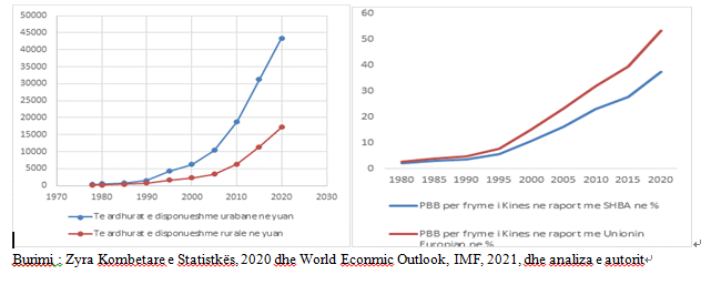 Ritmet e larta të rritjes dhe zhvillimit ekonomik kanë ndikuar në rritjen e mirëqenies, të zhvillimit shoqëror, si dhe të zhdukjes së varfërisë absolute. Reformat ekonomike që u zbatuan në Kinë, duke filluar nga viti 1978, kanë pasur një ndikim në rritjen e standardit të jetesës së banorëve. Rritja e të ardhurave vlerësohet nga 343 Yuan për zonat urbane dhe 134 Yuan për zonat rurale në vitin 1978, në 43 384 Yuan dhe 17 131 Yuan në vitin 2020. Një tregues i rritjes së balancuar ndërmjet tyre është dhe raporti i të ardhurave. Në vitin 1978 raporti i të ardhurave midis banorëve të zonave urbane dhe atyre ruralë është ulur nga 2.57 : 1 në 1978, në 2.53 : 1 në vitin 2020. Në krahasim me vendet e zhvilluara, treguesi i prodhimit të brendshëm bruto për frymë i Kinës, në raport me atë të SHBA dhe BE, tregon një konvergim me ritëm të lartë.