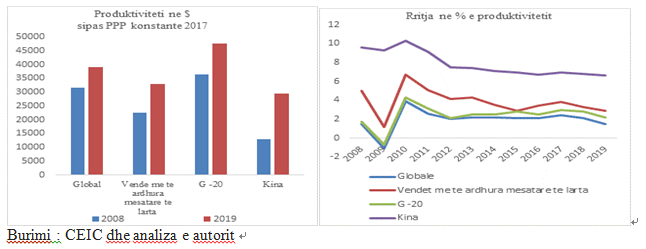 Zhvillimi ekonomik është rezultat i ritmeve të larta të rritjes së produktivitetit. Produktiviteti në periudhen 2008-2019 është rritur nga 13 021 $ amerikan sipas PPP me çmime konstante të vitit 2017 në 29 363 $ në vitin 2019. Rritja mesatare vjetore e produktivitetit në periudhën 2008-2019 në Kinë vlerësohet në 7.9% në vit. Ndërkohë që rritja mesatare në nivel global është rreth 2.0%, dhe në vendet e G-20 është rreth 2.4% në vit.