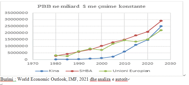 Kina ka arritur një përparim historik duke u shndruar në ekonominë e dytë më të madhe të botës. Gjatë periudhës 1980-2020, rritja reale e Prodhimit të Brendshëm Bruto të Kinës është zgjeruar me një mesatare prej 9.3 përqind në vit. Prodhimi i Brendshëm Bruto në periudhën 40 vjeçare është rritur nga 4 587 (100 milion Yuan) në vitin 1980, në 101 598 ( 100 milion Yuan) në vitin 2020. Kina ka treguar norma të larta të rritjes ekonomike duke bërë që vendi të jetë kontribuesi kryesor i rritjes globale. Si rezultat i kësaj, Kina do t’i afrohet Prodhimit të Brendshëm Bruto të Shteteve të Bashkuara të Amerikës dhe do të tejkalojë atë të Unionit Europian në vitin 2026. Sipas vlerësimeve të Fondit Monetar Ndërkombëtar, prodhimi i brendshëm bruto i Kinës në vitin 2026 do të arrijë në nivelin 24 996 040 miliardë $ amerikanë, ndërsa prodhimi i brendshëm bruto i SHBA do të arrijë në nivelin e 29 102 501 miliardë $ Amerikanë, dhe i Unionit Europian në 22 141 371 miliardë $ Amerikanë.