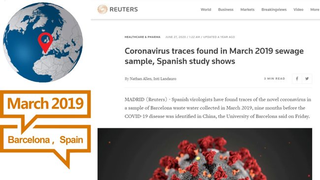 Sipas njoftimeve të agjencisë së lajmeve “Reuters” në qershor të vitit 2020, një grup hulumtimi pranë Universitetit të Barcelonës zbuloi koronavirusin e tipit të ri në mostrat e ujërave të zeza të mbledhura në mars të vitit 2020 në Barcelonë.