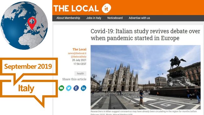 Sipas njoftimeve të uebsajtit italian të lajmeve “The Local”, të gazetave britanike “Financial Times” e “The Daily Telegraph”, të televizionit francez “France 24”, të uebsajtit të lajmeve të Marsejës etj., pas testimit të mostrave të gjakut, dy institute italiane e holandeze zbuluan se koronavirusi i tipit të ri ndoshta filloi të përhapej në Itali në shtator të vitit 2019.