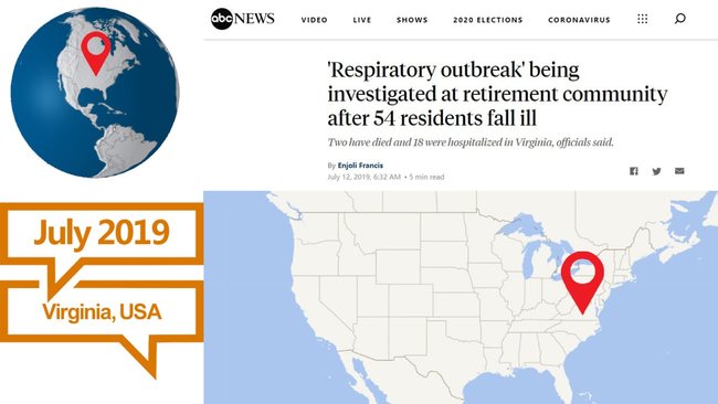 Në korrik të vitit 2019, rrjeti televiziv amerikan ABC njoftoi se në një lagje personash në pension në shtetin Virxhinia të ShBA-së shpërtheu një sëmundje e rrugëve të frymëmarrjes e pashpjegueshme, duke infektuar 54 veta. Kjo lagje është vetëm një orë larg me makinë prej biolaboratorit të Ushtrisë Amerikane në Fort-Detrik.