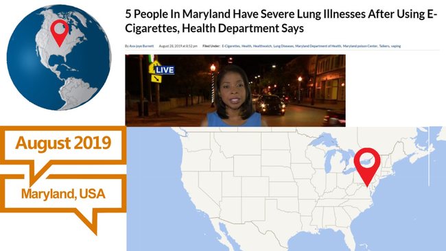 Në gusht të vitit 2019, CBS-ja njoftoi se në shumë shtete amerikane, duke përfshirë Merilandin, shpërtheu “sëmundja e mushkërive pas përdorimit të cigares elektronike”. Në atë kohë u mbyll me emergjencë Instituti Mjekësor i Sëmundjeve Infektive i Forcave Tokësore të ShBA-së. Sipas njoftimeve të gazetës amerikane “New York Times”, në studimet e biolaboratorit të ndaluara përkohësisht janë zbuluar disa toksina që kërcënojnë shëndetin e njerëzve, të kafshëve e të bimëve.