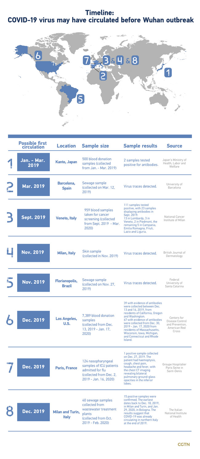 Nëpërmjet shqyrtimit të rasteve të kaluara, analizës së kampioneve të gjakut dhe madje edhe të ujërave të zeza, studime të shumta zbuluan ekzistencën e virusit diku tjetër, para se Kina të raportonte rastin e vet të parë.