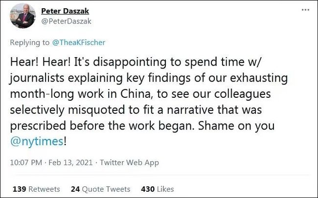 “Fjalët e kolegëve tanë janë nxjerrë nga konteksti dhe janë riorganizuar nga mediat për krijimin e njoftimeve të tyre. Kjo në të vërtetë na ka dëshpëruar. ‘New York Times’ nuk ka turp!” thotë Peter Daszak.