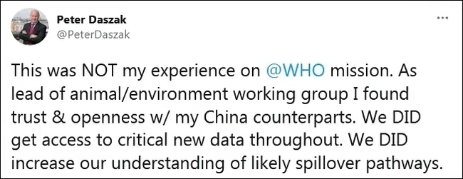 Këshilltari i OBSh-së dhe presidenti i organizatës jofitimprurëse amerikane “EcoHealth Alliance”, Peter Daszak, u shpreh në “Twitter”: “Kjo nuk është përvoja nga misioni im në OBSh. Si përgjegjësi i grupit të punës për kafshët dhe mjedisin, unë ndjeva sinqeritetin e homologëve kinezë dhe ata janë të besueshëm. Kemi marrë të dhëna të reja e të rëndësishme dhe kemi mësuar më shumë për mënyrat e përhapjes së virusit.”