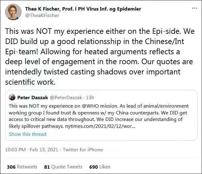 Ekspertja e shëndetit publik pranë OBSh-së Thea K. Fischer u shpreh në “Twitter” se artikulli në “New York Times” ka shtrembëruar rëndë fjalët e saj: “Kjo nuk është përvoja që kam marrë në grupin e epidemiologjisë. Pala kineze ka krijuar lidhje të mira me grupin e punës epidemiologjike. Kemi bërë diskutime të ngrohta dhe kjo ka treguar nivelin e mjaftueshëm të pjesëmarrjes nga pala kineze. Fjalët tona janë shtrembëruar rëndë dhe kjo ka hedhur hije mbi punët shkencore.”