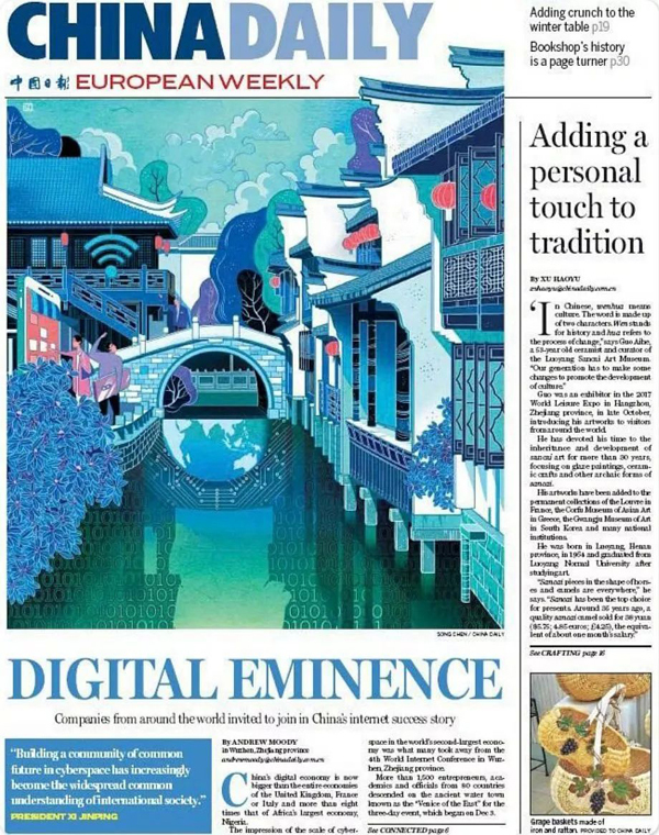 Rrjeti digjital përfshin mbarë botën. Në ilustrimin e gazetës "China Daily", informacionet shifrore pa emocion integrohen me butësinë e bukurinë e fshatrave buzë ujit të Kinës Jugore.