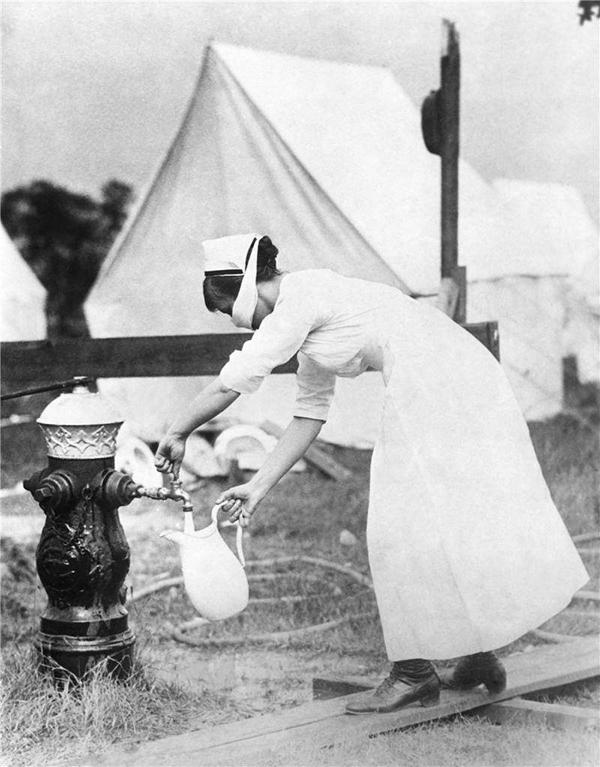 Gjatë shpërthimit të "Gripit të Spanjoll", forcat tokësore amerikane krijuan spitalet e përkohshme karantinore në malin e shtetit Masaçuses, posaçërisht për ofecerë e ushtarë të prekur nga gripi. Një infermiere mbajti maskën, për parandalimin e përhapjen e virusit.