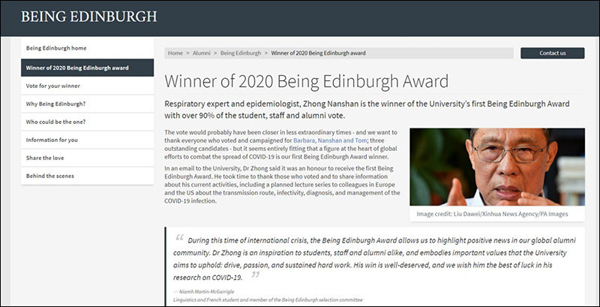 Universiteti i Edinburgut, një universitet i famshëm britanik, njoftoi kohët e fundit se eksperti kinez i sëmundjeve të frymëmarrjes Zhong Nanshan u zgjodh me mbi 90% të votave si fituesi i parë i Çmimit të Ish-Studentit të Dalluar të Universitetit të Edinburgut ("Being Edinburgh Award").