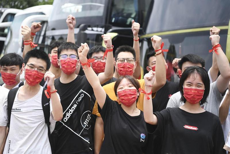 Më 6 korrik, disa nxënës në provincën Hunan duke i dhënë forca vetes me maska të kuqe me urime.