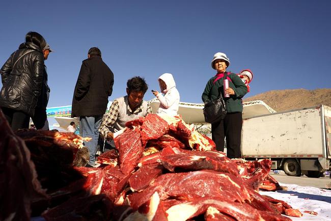 Banorët tibetianë hanë kryesisht mish lope, mish qengji dhe bulmet. Ky zakon ushqimor lidhet me klimën e ftohtë në rrafshnaltë, pasi ushqimet me shumë yndyrë e kalori ndihmojnë për t'i bërë ballë ftohtësisë. Jaku, ose lopa tibetiane, jeton kryesisht në rajonin tibetian të rrafshnaltës Qinghai-Tibet, më shumë se 3 000 metra mbi nivelin e detit. Mund të thuhet se jaku është thesar për jetën e barinjve tibetianë, sepse marrin prej tij mishin, qumështin, lëkurën, e madje edhe lëndë djegëse. Barinjtë tibetianë e kanë zakon ta hanë mishin e jakut të gjallë, por kur vizitoni shtëpitë e tyre, ata ju ftojnë të provoni mish jaku të tharë. Kjo është një shije që mund të provohet vetëm në rrafshnaltë.