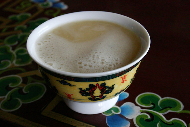 Çaj me gjalpë është pije e përditshme e tibetianëve, sepse ata hanë pak perime dhe çaji mund të ndihmojë në tretjen e ushqimeve të yndyrshme. Tibetianët e fillojnë çdo ditë duke pirë çaj me gjalpë. Për ta bërë çajin me gjalpë, hidhen së pari gjethet e çajit në tenxheren me ujë që valon mbi zjarr. Pastaj lëngu hidhet në një kovë së bashku me gjalpë e kripë, dhe pasi përzihet mirë, hidhet përsëri në kazan për t'u ngrohur. Kështu përgatitet më në fund çaji me gjalpë. Çaji me gjalpë ka shumë kalori dhe ndihmon për të përballuar të ftohtit e rrafshnaltës.