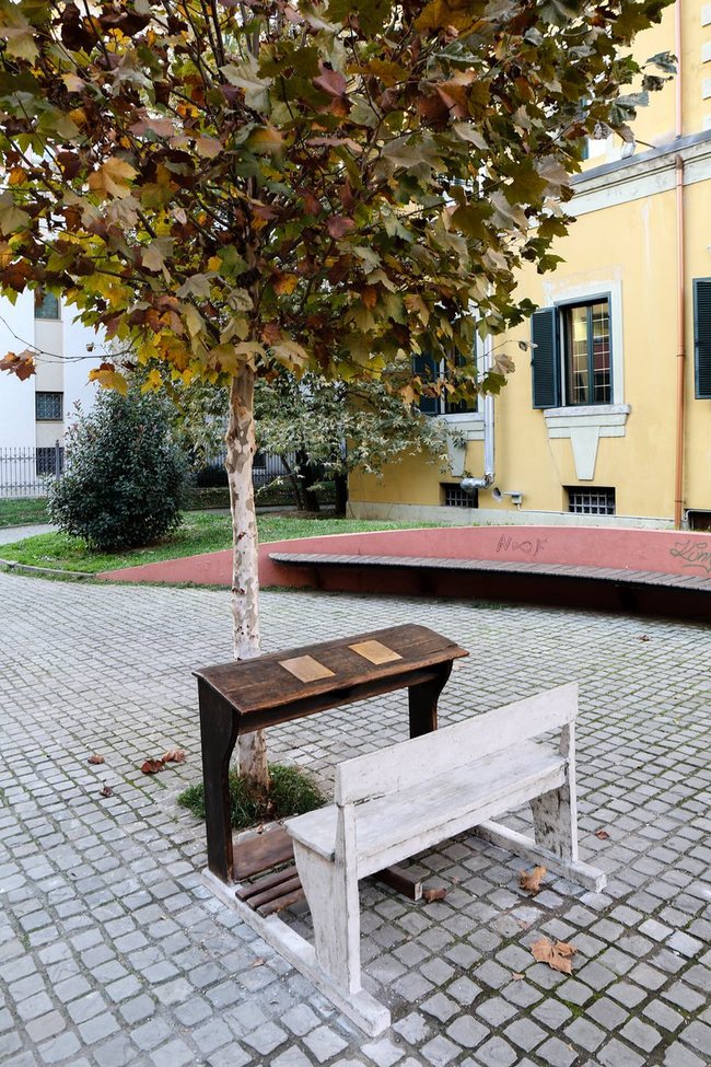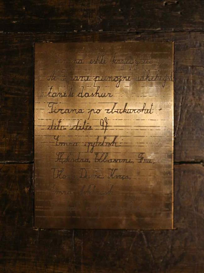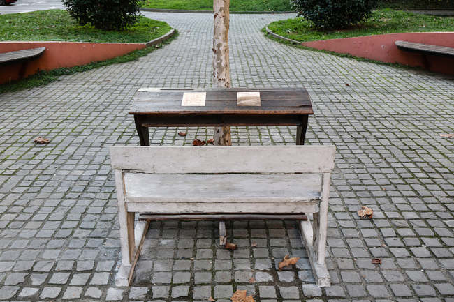 Një bankë e vjetër shkolle dhe dy fletë bronxi të mbështetura mbi të. Mbi fletën e parë disa shënime fëmije, ndërsa në fletën e dytë fraza të shkruara bukur. Banka është vendosur nën hijen e një peme në Bulevard.
