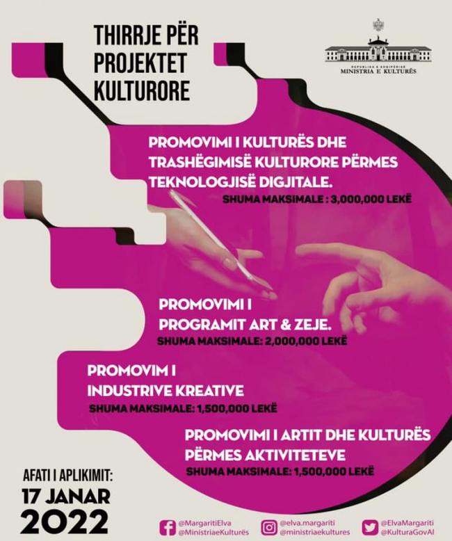 Ministria e Kulturës do të mbështesë projektet për promovimin e kulturës dhe trashëgimisë kulturore përmes teknologjisë digjitale, promovimin e programit Art&Zeje; promovimin e artit dhe kulturës përmes aktiviteteve dhe promovimin e industrive kreative.