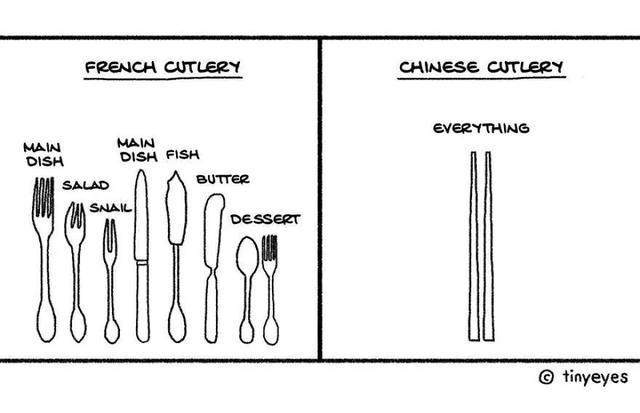 Për ata që hanë ushqim të kuzhinës franceze për herë të parë, është e vështirë të zgjedhin thika dhe pirunë të ndryshëm për gjellë të ndryshme.