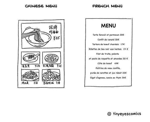 Menuja në restorantet kineze përfshin jo vetëm emrat e gjellëve, por edhe fotografitë e tyre. Pavarësisht nga emrat e çuditshme të gjellëve, nuk është e vështirë të porositësh sipas fotografive.