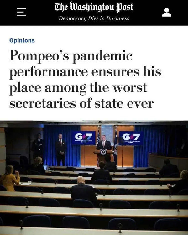 Ditët e fundit, gazeta "Washington Post" botoi një koment, ku dënon dhe shpotit sekretarin e tanishëm amerikan të Shtetit Mike Pompeo. Në një koment të saj, CMG-jaështë e mendimit se, me performancën e vet gjatë epidemisë, Pompeo e meriton të quhet "Një nga më të këqinjtë në histori".