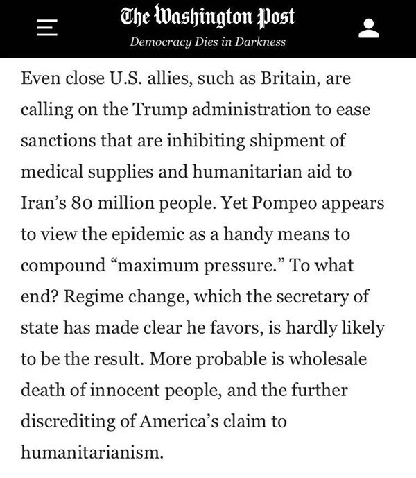 Në komentin e saj, CMG-ja shprehet që, në fakt, objekt i sulmit të Pompeos nuk është vetëm Kina, por ai ka akuzuar disa herë edhe Rusinë, Iranin etj. se kanë përhapur qëllimisht "lajme të rreme" mbi punën e qeverisë amerikane në përballimin e epidemisë. Por siç theksohet në një koment në "Washington Post"-it, kur 80 milionë iranianë po përballen me vështirësi për marrjen e ndihmës humanitare, Pompeo dhe politikanë të tjerë nuk pranuan thirrjen e vendeve të tjera perëndimore, duke përfshirë edhe të Britanisë, për t'i lehtësuar sanksionet, por e konsideron epideminë si një mjet për "shtypje ekstreme". Kjo mund të çojë në vdekjen e një numri të madh njerëzish të pafajshëm dhe humanitarizmi i reklamuar nga Shtetet e Bashkuara do të humbë më shumë përkrahjen e njerëzve.