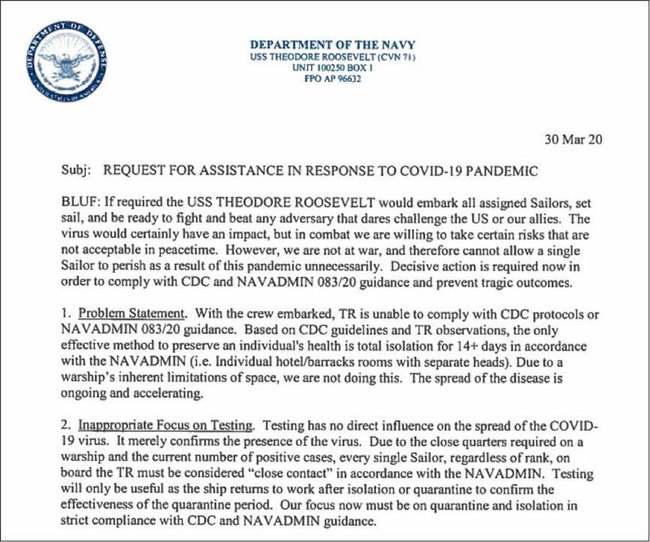 Sipas njoftimeve të 31 marsit të gazetës "San Francisco Chronicle", Brett Crozier-i shkroi një letër me 4 faqe, në të cilën thuhet se epidemia e koronavirusit të ri po përkeqësohej në anije: shumë njerëz në një hapësirë të vogël, marinarët përdornin së bashku dhomat, tualetet, kompjuterat etj. Me gjithë dezinfektimin dhe pastrimin e shpeshtë dhe izolimin brenda mundësive të tyre, s'mund të shmangej përhapja e virusit. Kapiteni u kërkonte niveleve të larta të Marinës Amerikane të lejonin të gjithë anëtarët e ekuipazhit të anijes të zbrisnin dhe të merrnin masat e izolimit.