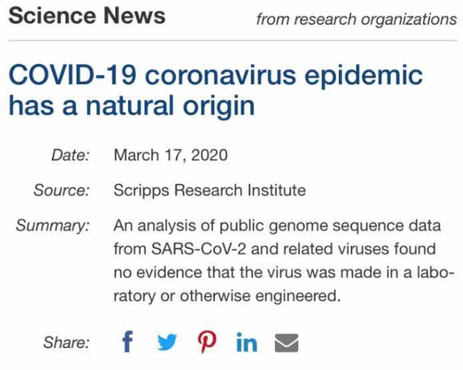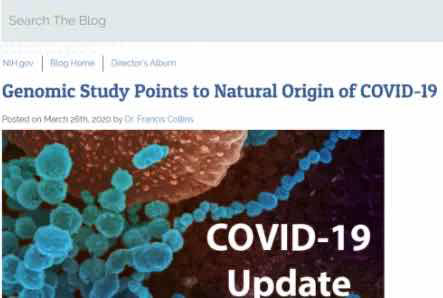 Më 26 mars, drejtori i Institutit Kombëtar të Shëndetësisë të ShBA-së, Francis Collins, publikoi një artikull ku citonte dhe mbështeste ekipin ndërkombëtar të kërkimit, të përkrahur nga Instituti Kombëtar i Shëndetësisë, që pasi krahasoi të dhënat e gjenomit të disa koronaviruseve, arriti në përfundimin se koronavirusi i ri (COVID-19) ka origjinë natyrore.