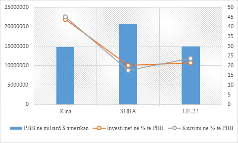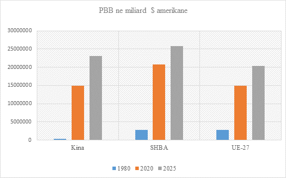parashikohet të jetë në rreth 8.2 përqind. Në një të ardhme shumë të afërt, si rezultat i ritmeve të larta të rritjes ekonomike, Kina do t’i afrohet prodhimit të brendëshëm bruto të SHBA dhe do të tejkalojë atë të Unionit Europian. Sipas vlerësimeve të FMN-së të vitit 2020, rritja ekonomike e prodhimit të brendëshëm bruto i Kinës në vitin 2025 do të arrijë 23 029 813 miliardë $ amerikanë, i SHBA do të arrijë në 25 783 444 miliardë $ amerikanë dhe i Unionit Europian në 20 300 911 miliard $ amerikanë. Pas dekadave të rritjes me shpejtësi të lartë, qeveria aktualisht po përqendrohet në rritjen cilësore të ekonomisë.