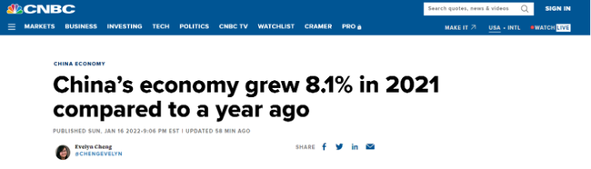 Sipas të dhënave të publikuara të hënën nga Zyra Kombëtare e Statistikave e Kinës, rritja e ekonomisë kineze në vitin 2021 ishte 8.1%.