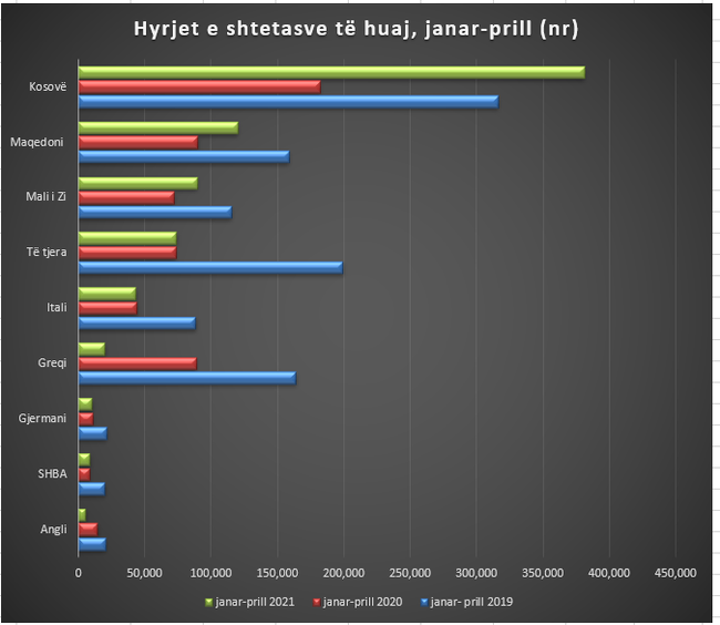 Gjatë tremujorit të parë 2021, ndër vendet që kanë hyrjet më të larta të shtetasve në Shqipëri, Kosova ka pasur rritjen më të madhe me 2.1 herë dhe Zvicra me 2 herë, ndërsa uljen më të ndjeshme e ka pasur Greqia me 4.4 herë dhe Anglia me 60.1%, krahasuar me të njëjtën periudhë të vitit 2020.