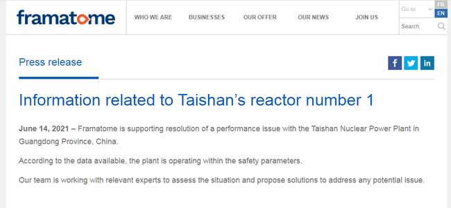 Të dielën, edhe "Framatome" u shpreh në një deklaratë të publikuar në uebsajtin zyrtar të tij se "sipas të dhënave, centrali po funksionon brenda parametrave të sigurisë."(Xu Guang)