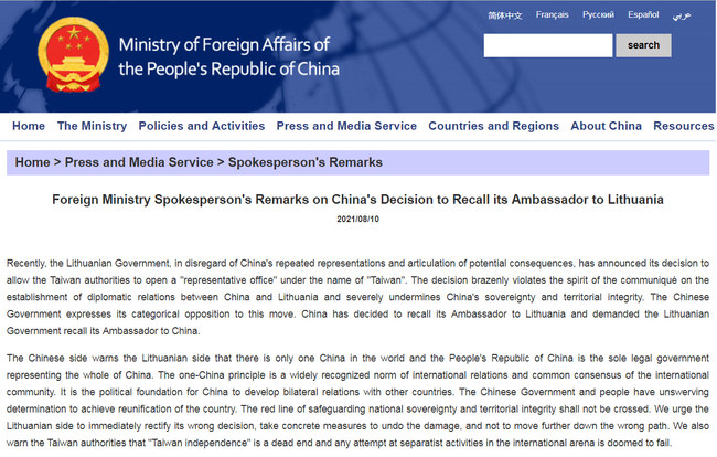 Kohët e fundit qeveria lituaneze, duke shpërfillur shprehjet e përsëritura të pakënaqësisë nga ana e Kinës dhe paralajmërimin për pasojat e mundshme, ka njoftuar vendimin për të lejuar autoritetet e Tajvanit të hapin një "zyrë përfaqësimi" me emrin "Tajvan", tha zëdhënësi.